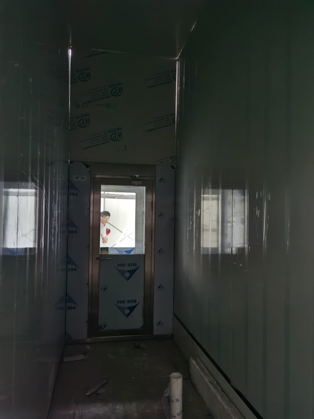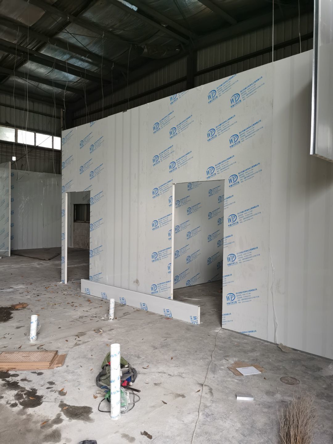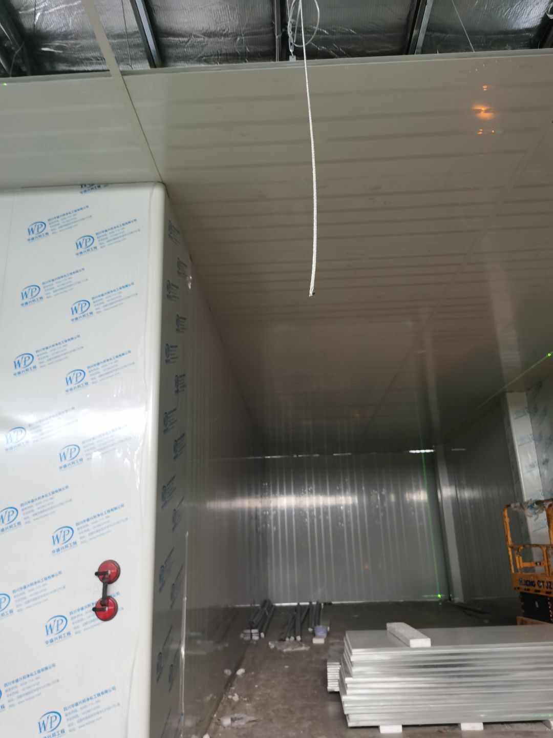 1,彩鋼墻板立板除預(yù)留設(shè)備外完成100% 2,彩鋼板吊頂除預(yù)留外,完成95% 3,三防板吊頂完成100% 4,水電安裝完成60% 5,彩鋼板收尾工作完成30%