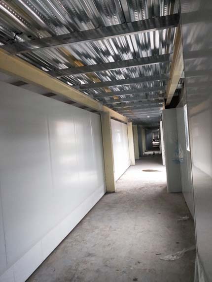 1:彩鋼墻板完成98% 2:彩鋼頂板完成100% 3:撕膜打膠完成98% 4:自制門窗完成95% 5:水電完成75% 6:圓弧完成85% 7:金剛砂完成100% 8:三防板吊頂完成100% 9:地面固化完成100% 10:動力電完成60% 11:空調安裝完成100%