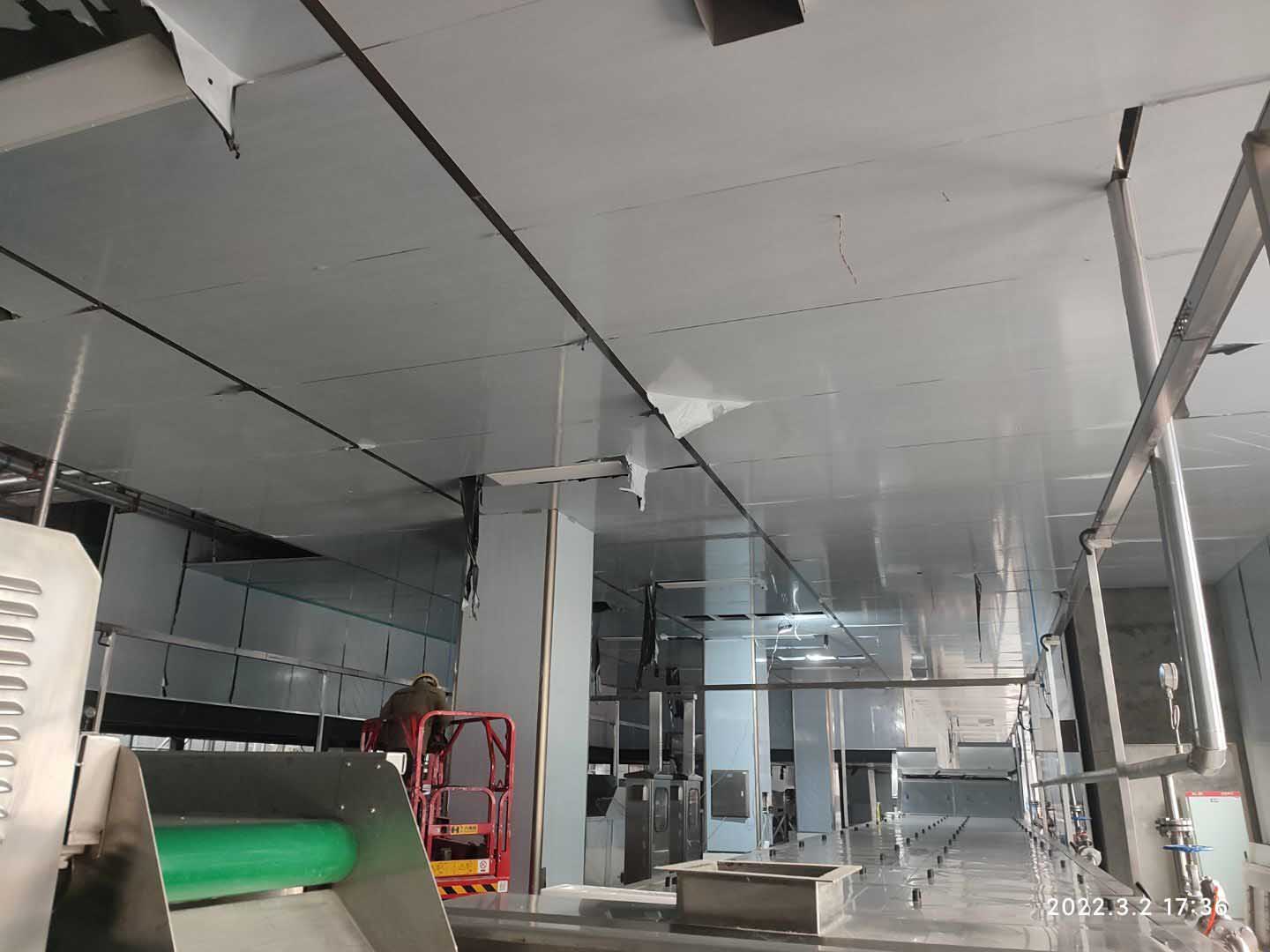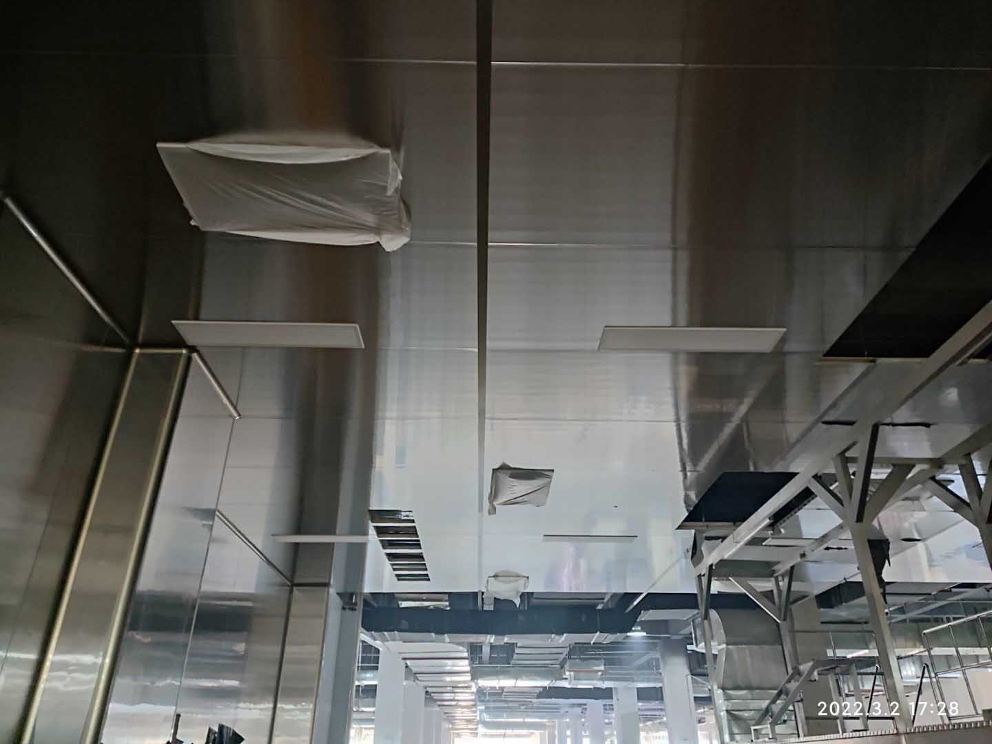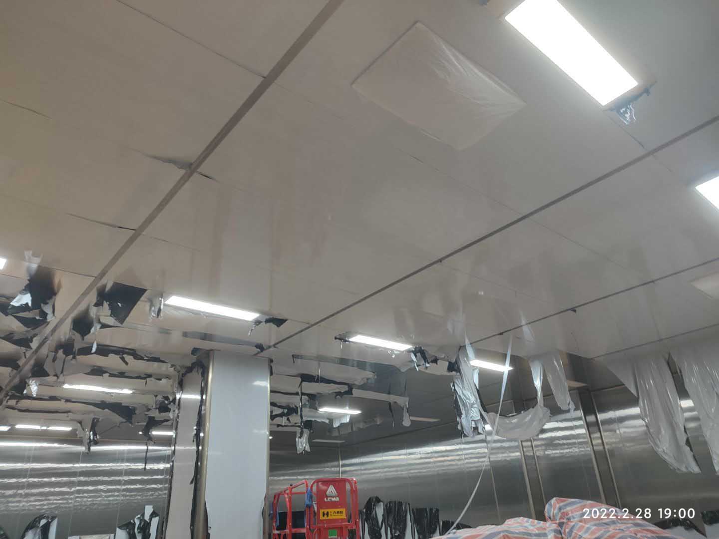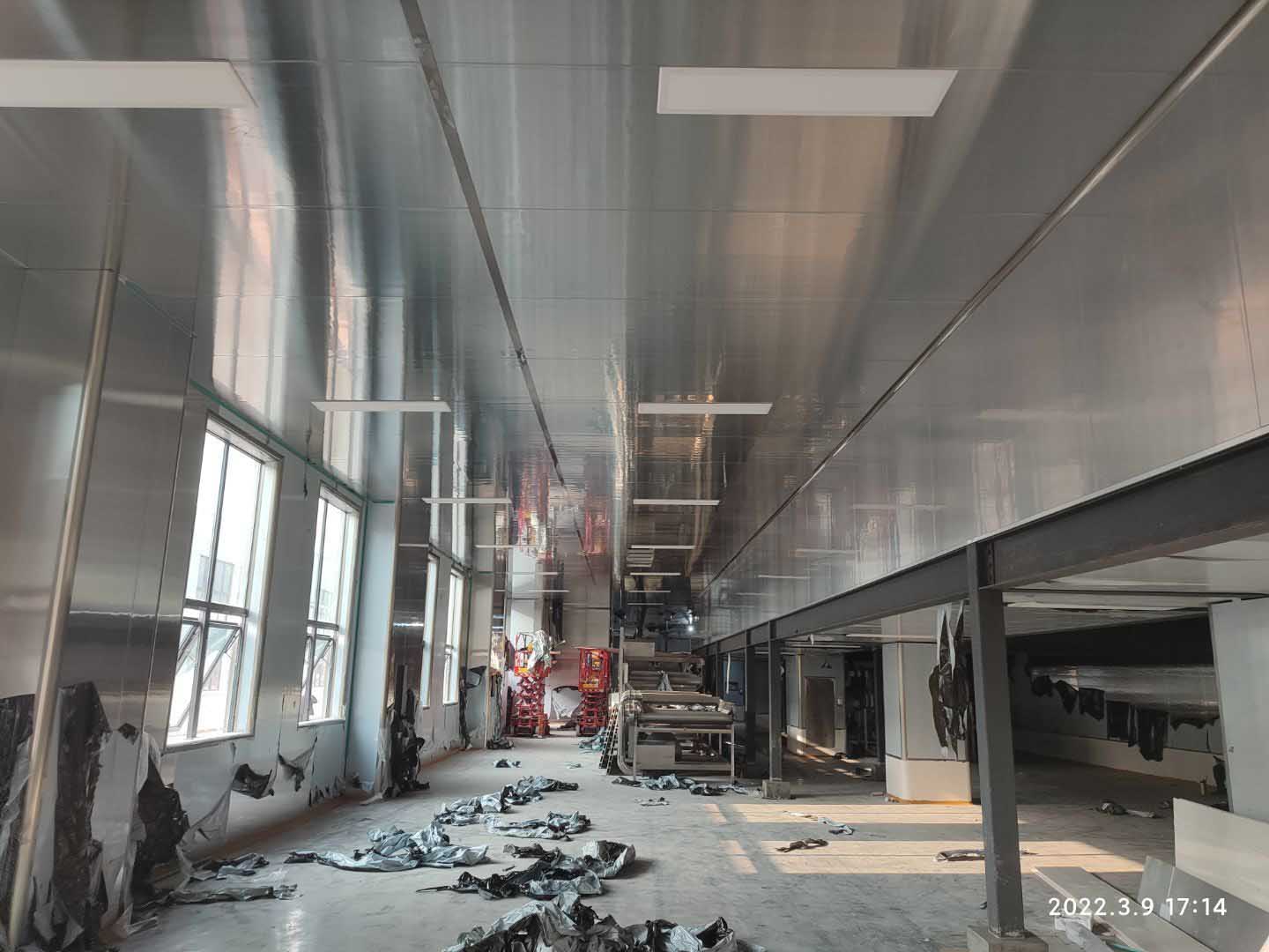1,彩鋼板工程整體完成90%; 2,照明完成92%,插座完成90%; 3,空調末端風管安裝完成90%,高效濾芯及擴散孔板完成80%,1,2號機組空吹完成。