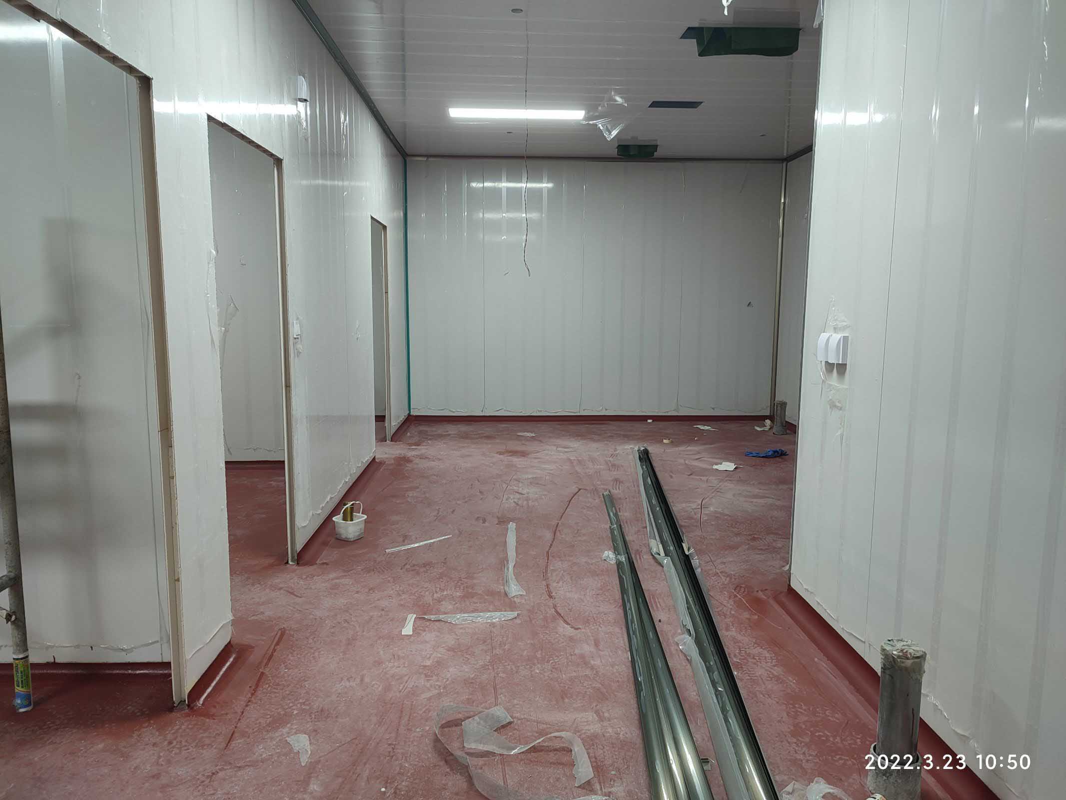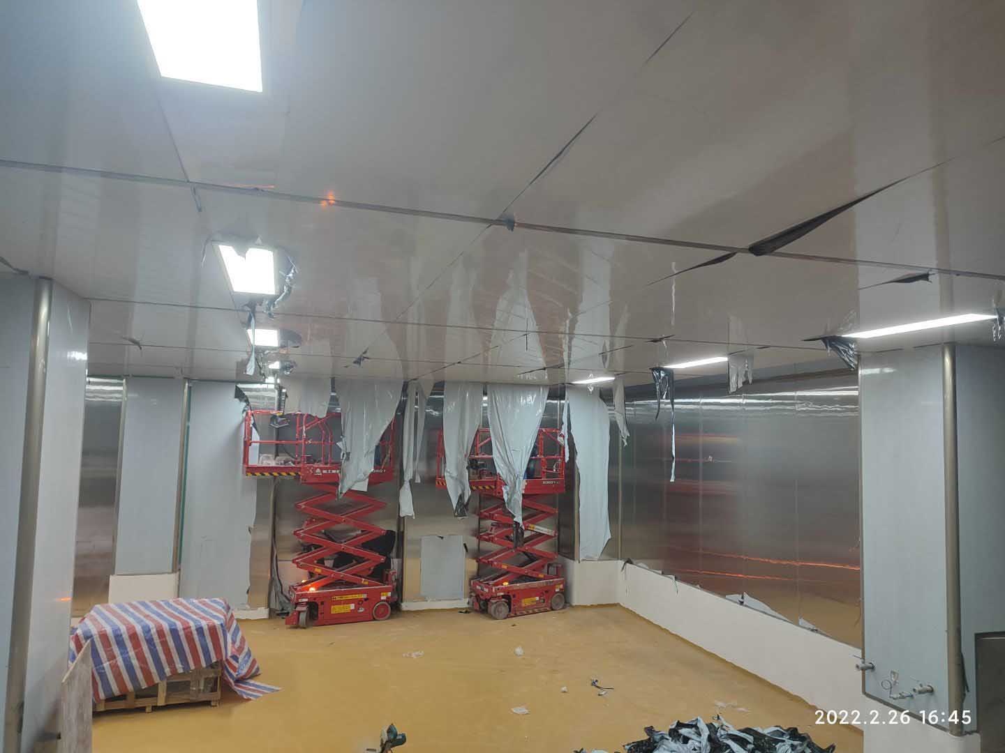 1,彩鋼板吊頂完成85% 2,組空配管完成30% 3,照明插座布線完成65%,燈具安裝完成40% 4,高效和回風末端風管尺寸量取完成。