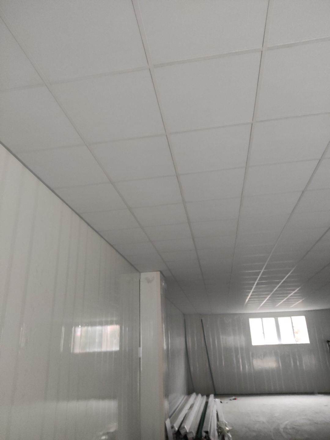 二樓車間凈化板吊頂完成,圓弧安裝完成約10%;一樓車間內三防板吊頂完成,一樓車間圓弧安裝完成約80%;單層廠房擋水墻砌磚完成約80%。