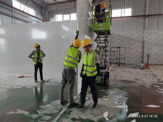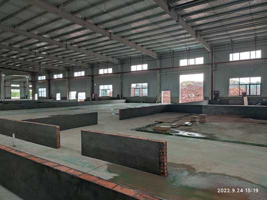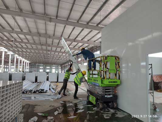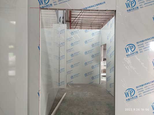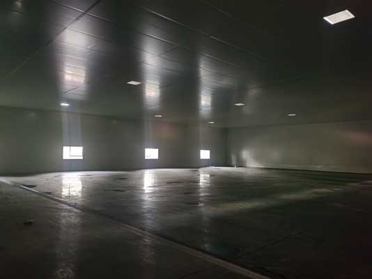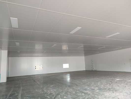 1,彩鋼板隔墻完成90%,頂板完成70% 2,固化地坪完成80% 3,照明及插座底座安裝完成50%,穿管穿線完成15%,換氣扇定位完成40%,燈具安裝30% 4,風管安裝完成20%,空調水管除銹刷漆完成80%