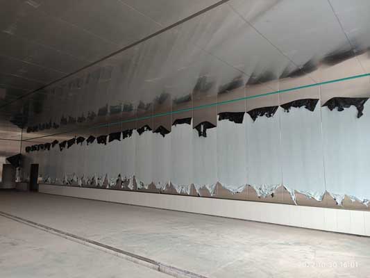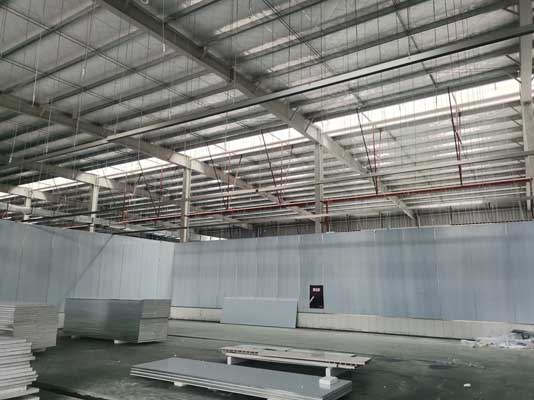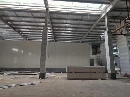 1、彩鋼板累計到貨14800㎡,隔墻及吊頂安裝完成約13500㎡; 2、地面密封固化完成80%; 3、空調水管道安裝完成30%,風管安裝完成50%; 4、照明燈具安裝完成25%、線路敷設完成15%。