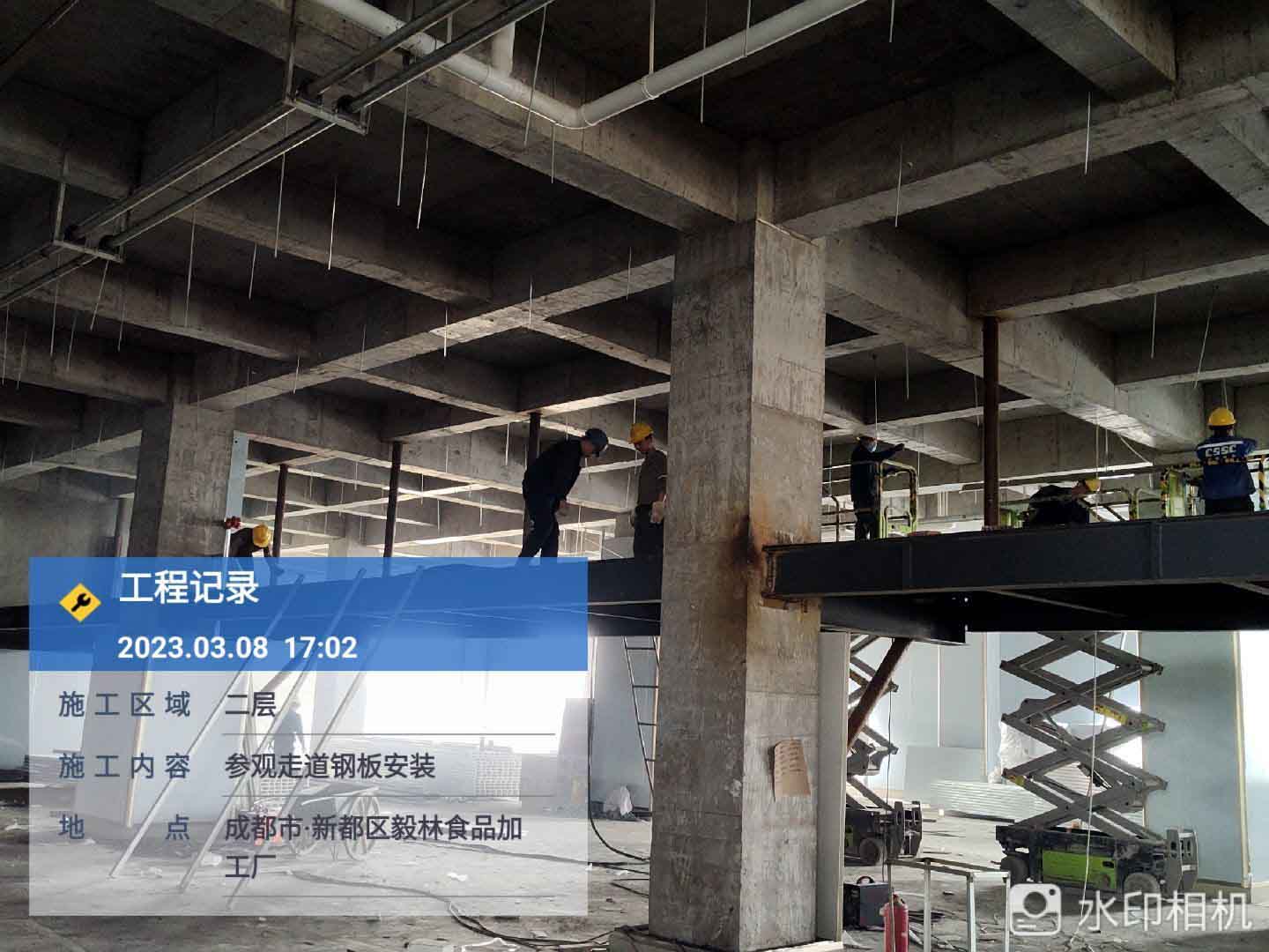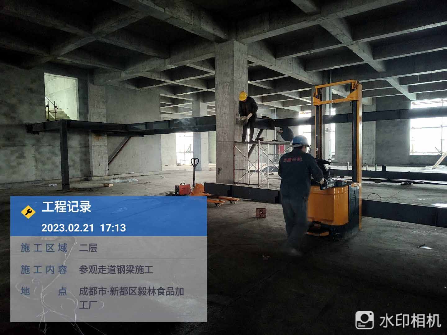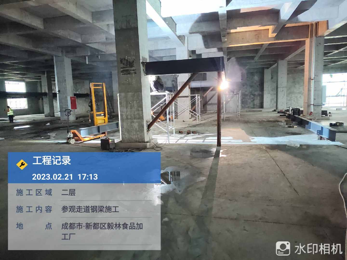 1、四層防水閉水中 2、三層燈具、電源線安裝完成40% 3、三層已安裝吊頂區域打膠收邊完成80% 4、三層冷水給水管安裝10% 5、二層彩板頂板30% 6、二層不銹鋼排水立管焊接30% 7、二三層參觀走道矩管框架焊接100%
